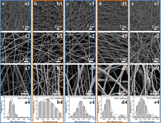 图3a-e显示了PCL/PCS纤维支架的扫描电子显微镜照片和纤维直径。总的来说,所有样品都表现出典型的非织造纳米纤维结构,具有成层沉积的纳米纤维和较高的孔隙率。但是,加入PCS后会出现毛细纤维、珠状纤维和扁平带状纤维等不规则纤维,导致纤维直径分布不均匀,从而影响纳米纤维支架的力学性能。用Image J软件对纤维支架的平均直径进行测量和计数,发现在适当的PCS浓度下,纤维的直径分布符合正态分布,没有毛细和扁平的带状纤维(PCL/PCS-15),有利于纤维支架的制备和应用。