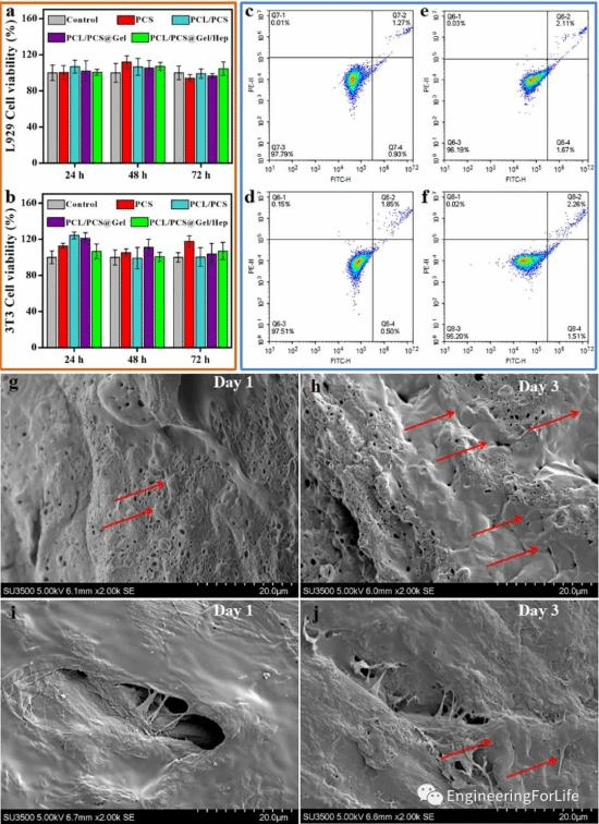 5. 纳米纤维支架的生物相容性评价纳米纤维支架良好的生物相容性是其在组织工程中应用的重要前提。图7a和b显示了与空白对照组相比,不同纳米纤维支架组的细胞存活率,纳米纤维支架组与对照组相比无明显差异,说明纳米纤维支架材料具有较高的生物相容性。为了评估3D纳米纤维支架的细胞附着性,将细胞结合的纳米纤维支架培养1天和3天,用扫描电子显微镜对细胞形态进行了评价(图7g-j),第一天,三维PCL/PCS@Gel/HEP纳米纤维支架上附着着形态良好的细胞,细胞在纳米纤维支架上铺展良好,而2D PCL/PCS纳米纤维支架上几乎没有细胞。第3天,与2D支架相比,3D PCL/PCS@Gel/HEP纳米纤维支架上附着的细胞更多,表现出更好的细胞-基质相互作用。为了进一步评价3D纳米纤维支架对细胞增殖过程的影响,用流式细胞仪分析了细胞的凋亡情况,如图7c-f所示,纳米纤维支架不会对细胞产生额外的刺激进而诱导细胞凋亡。因此,制备的纳米纤维支架具有良好的生物相容性,满足作为创面愈合潜在组织支架材料的基本要求。