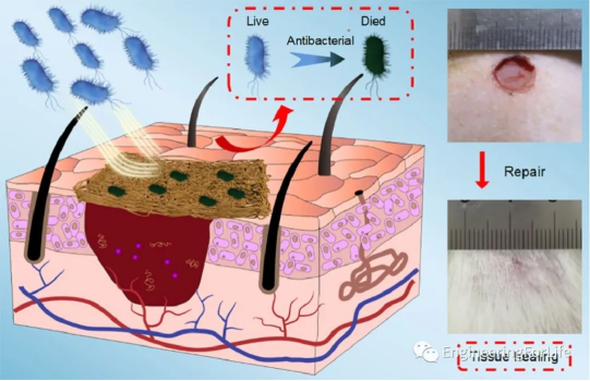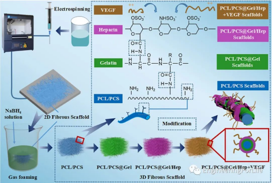电纺丝是一种快速、高效、不间断制备均匀纳米纤维支架的方法。近年来,纳米纤维支架在组织工程(骨、软骨愈合、神经再生、血管再生、皮肤愈合等)、药物输送和癌症治疗等方面的应用取得了很大进展。电纺纳米纤维支架具有超细纤维尺寸和高比表面积的特点,这使其在组织工程再生领域具有良好的发展前景。三维(3D)纳米纤维创面敷料不仅要保持较大的比表面积和良好的透气性,而且要具有优异的吸水性。本文以聚己内酯/聚赖氨酸改性壳聚糖(PCL/PCS)为骨架,模拟细胞外基质,制备电纺三维纳米纤维支架。通过静电吸附将明胶和肝素(Gel/Hep)组装到PCL/PCS纤维表面,并将血管内皮生长因子(VEGFs)同步掺入到Gel/Hep层中,形成了多功能三维纳米纤维支架。如图1所示,这种多功能三维纳米纤维支架具有良好的抗菌能力、血液相容性和生物相容性,可通过抑制伤口部位的炎症反应,促进伤口愈合过程中的血管生成,作为伤口敷料用于伤口愈合。