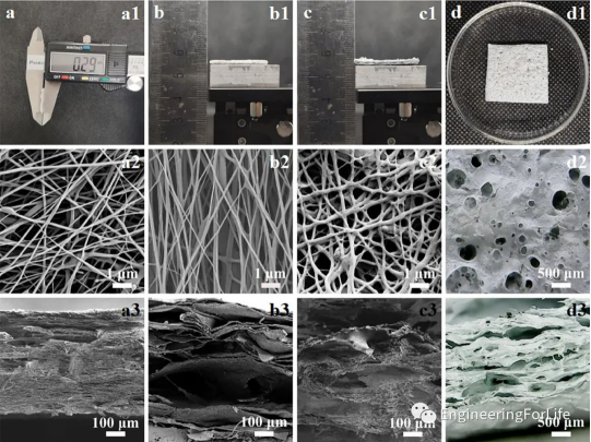 2. 三维纳米纤维支架的物理化学评价通过静电纺丝制备的纳米纤维支架由随机堆积的纤维组成,形成了宏观上具有较低比表面积的2D致密纳米纤维膜结构(图4a1)。尽管在扫描电子显微镜下观察到纳米纤维支架彼此不粘连并且有大的空隙(图4a2),但纳米纤维支架由密集排列的纤维结构组成,这导致了严重的纳米纤维粘连。膨胀后,纳米纤维支架(3D PCL/PCS)的厚度从0.29 mm显著增加到2 mm(图4b1)。用扫描电子显微镜观察了三维PCL/PCS纳米纤维支架的表面和截面形貌(4b2和b3),纤维直径没有明显变化,但纳米纤维支架内部变得更加疏松。上述分析表明,在气体发泡过程中,会产生大量气泡,增加具有多层结构的支架层的孔隙率,导致纳米纤维支架厚度的增加。与未经Gel和HEP交联修饰的PCL/PCS纳米纤维支架相比,3D PCL/PCS@Gel/HEP纳米纤维支架的厚度、表面和横截面形态没有显著变化(图4c1-c3)。图4d显示了3D PCL/PCS@Gel/HEP纳米纤维支架的光学图像,可见3D PCL/PCS@Gel/HEP纳米纤维支架的表面疏松而粗糙地折叠(图4d2),横截面上有更明显的气孔(图4d3)。