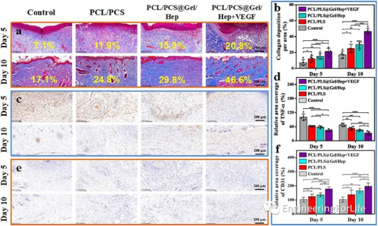 伤口组织中胶原蛋白的含量也可以作为评估伤口再生效果的一种方法。图10a显示了马森染色的结果,PCL/PCS@Gel/Hep+VEGF中的胶原纤维结构完整,呈波状排列,密度较高,分布更均匀。在伤口愈合过程中,四组的胶原沉积持续增加(图10b)。免疫组织学染色如图10c和d所示,在第5天和第10天,PCL/PCS@Gel/HEP+血管内皮细胞生长因子纳米纤维支架组的肿瘤坏死因子-α的表达低于医用纱布组,表明这些纳米纤维支架具有更好的预防感染的能力。此外,如图10e和图f所示,在第5天和第10天,PCL/PCS@Gel/Hep和PCL/PCS@Gel/Hep+VEGF纳米纤维支架覆盖的创面CD-31阳性表达高于医用纱布组,促进了创面愈合过程中的血管生成。