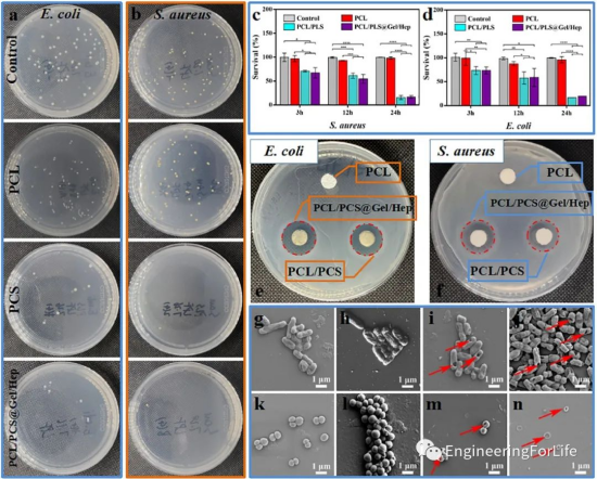 3. 纳米纤维支架的抗菌能力为了评价3D纳米纤维支架的抗菌活性,以大肠杆菌和金黄色葡萄球菌为模型菌,分别进行了细菌溶液浊度、抑菌圈试验、平板菌落计数法和细菌形态的扫描电子显微镜观察。图5a和b显示了在PCL/PCS和PCL/PCS@Gel/HEP纳米纤维支架组中,大肠杆菌和金黄色葡萄球菌菌落数显著减少。与对照组相比,PCL/PCS和PCL/PCS@Gel/HEP纳米纤维支架共培养24小时后,大肠杆菌和金黄色葡萄球菌的存活率仅为15%左右(图5c-d),而PCL纳米纤维支架组细菌存活率无明显变化。为了进一步研究3D PCL/PCS和PCL/PCS@Gel/HEP纳米纤维支架的抗菌性能,比较了抑菌圈大小。图5e和图5f显示了培养24小时后PCL/PCS和PCL/PCS@Gel/HEP纳米纤维支架的细菌抑制透明区远大于对照组。用扫描电子显微镜进一步观察了PCL/PCS和PCL/PCS@Gel/Hep共培养后的大肠杆菌和金黄色葡萄球菌的形态,如图5g-n所示,细菌的细胞膜破裂,导致细菌完全死亡。这些结果证实了含有PCS的纳米纤维支架破坏了细菌膜的完整性。