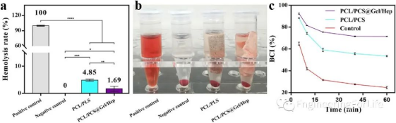 4. 体外血液相容性血液相容性在激活血细胞和启动伤口愈合过程中起着重要作用。如图6a和图b所示,PCL/PCS@Gel/HEP纳米纤维支架的溶血率为1.69%,低于PCL/PCS纳米纤维支架的4.85%,表明PCL/PCS@Gel/HEP纳米纤维支架无溶血作用。体外动态全血凝血时间实验图6c显示了纳米纤维支架的动态血液抗凝指数(BCI)和血液凝固光学照片。当纳米纤维支架与血液接触时间控制在5min时,PCL/PCS和PCL/PCS@Gel/Hep的BCI分别为88.33%和92.45%,高于对照组(64.91%),显示出最强的血栓抑制能力。
