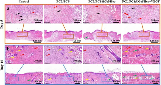 6. 创面在体内的愈合为了评估3D纳米纤维支架在伤口修复中的潜力,进行了SD大鼠全层皮肤损伤再生实验,以证实3D纳米纤维支架敷料促进创面愈合的能力。图8a显示了治疗6d后,纳米纤维支架组创面面积小于医用纱布组。另外,在三种纳米纤维支架组中,PCL/PCS@Gel/Hep+VEGF组创面面积最小。图8b显示PCL/PCS@Gel/Hep+VEGF组治疗10d后创面完全愈合,创面可见新生毛发生长。伤口面积和愈合率相对于伤口再生时间的计算进一步表明,PCL/PCS@Gel/Hep+VEGF组显示出良好的伤口闭合效率(图8c-d)。这些结果表明PCL/PCS@Gel/HEP复合纤维可作为潜在的组织工程支架用于组织再生。在纳米纤维支架中掺入血管内皮生长因子对创面愈合有协同促进作用。