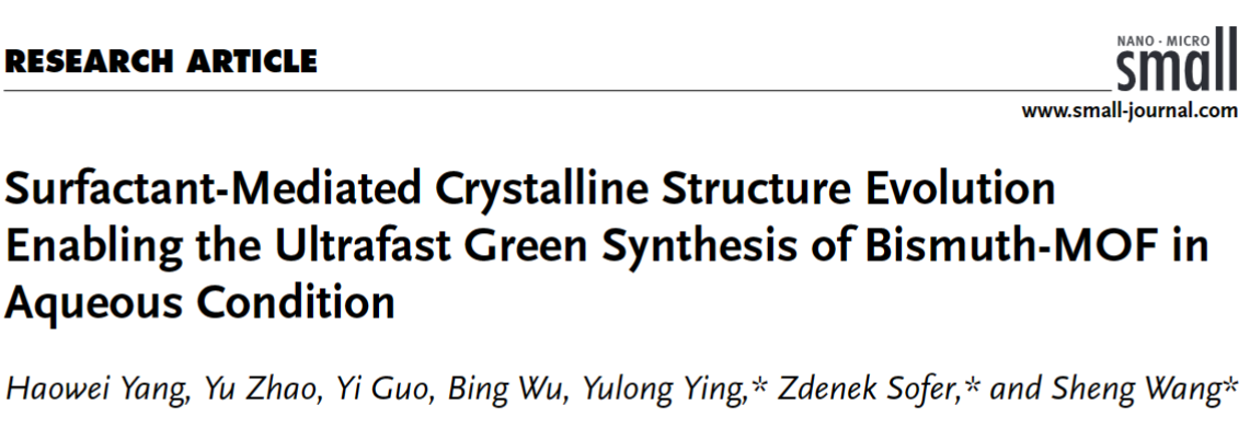 近日,MK体育青年教师应玉龙副教授和王晟教授团队在前期铋基金属有机骨架形貌调控研究的基础上,提出了一种新的策略:利用表面活性剂为结构诱导剂,在水相条件下伴随超声辐照构建具有复杂拓扑结构的铋基金属有机骨架CAU-17。该成果发表在国际高水平期刊《Small》。MK体育硕士研究生杨皓为为第一作者,MK体育应玉龙副教授、王晟教授和布拉格化工大学Zdenek Sofer为通讯作者,公司为第一通讯单位。