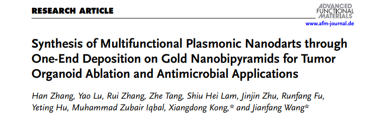 近日,MK体育孔祥东教授团队联合香港中文大学王建方教授团队合作报道了一种新型等离激元纳米材料的制备方法,即在金纳米双锥的一端选择性地沉积 AgPd 双金属,形成AgPd 纳米飞镖,从而获得飞镖状纳米结构,在近红外II区光热催化协同作用下,显示出优异的抗肿瘤及抗菌效果。相关成果发表于材料科学TOP期刊Adv. Funct. Mater.(IF=19),通讯作者为MK体育孔祥东教授与香港中文大学王建方教授。公司章瀚特聘副教授、2021级博士研究生张瑞为共同第一作者,公司为第一通讯单位。
