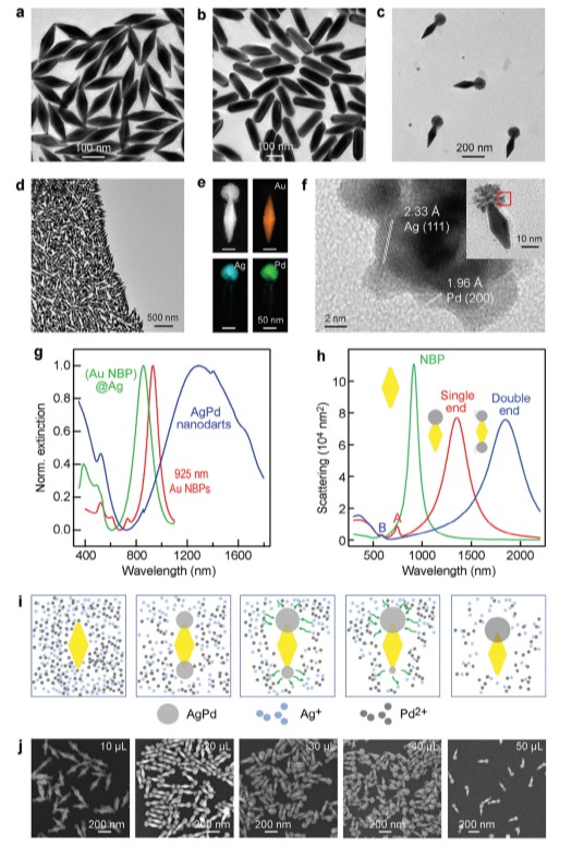 本研究证明了通过电置换、共还原和奥斯瓦尔德熟化效应的组合,可以实现在Au 纳米双锥 (NBPs)的一端选择性沉积AgPd 纳米颗粒 (NPs),形成“飞镖状”AgPd纳米粒子(图2)。