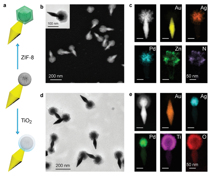 图4. AgPd@ZIF-8和AgPd@TiO2纳米飞镖的合成。