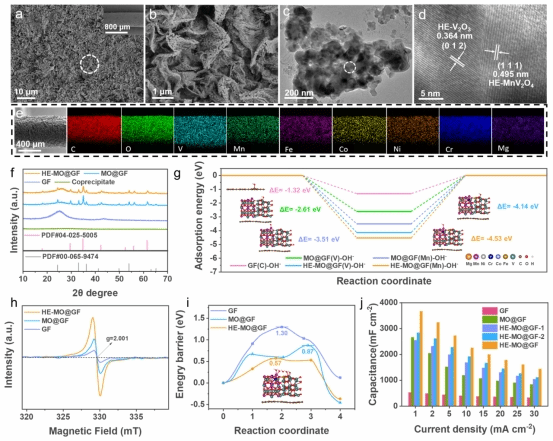 图2. HE-MO@GF的结构表征、电化学性能与储能机制