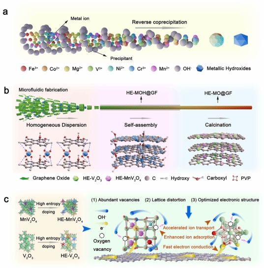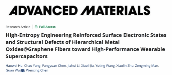 该工作从设计纤维电极有序微结构和高电化学活性入手,以强化界面法拉第电荷转移、离子传质、赝电容存储为目标,构筑了高熵掺杂金属氧化物@石墨烯复合纤维 (HE-MO@GF) 材料,用于高能量密度可穿戴超级电容器研究。该研究成果于发表在国际材料顶级期刊《Advanced Materials》上 (High-Entropy Engineering Reinforced Surface Electronic States and Structural Defects of Hierarchical Metal Oxides@Graphene Fibers towards High-Performance Wearable Supercapacitors, Advanced Materials 2024, 2406483)。该论文的通讯作者是MK体育武观研究员,MK体育硕士研究生胡昊威、青年教师杨超为论文的共同第一作者。