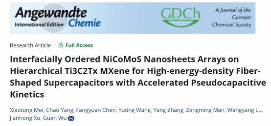 该工作从设计纤维电极的高活性有序界面、稳定界面耦合、快速界面电荷传递与反应等入手,通过微流控限域组装技术,构筑了界面有序多硫化物纳米片阵列 (NiCoMoS)-分级Ti3C2Tx MXene的先进核壳结构纤维,用于快速赝电容动力学的高能量密度超级电容器研究。该研究成果于发表在国际重要刊物《Angewandte Chemie》上 (Interfacially Ordered NiCoMoS Nanosheets Arrays on Hierarchical Ti3C2Tx MXene for High-energy-density Fiber-Shaped Supercapacitors with Accelerated Pseudocapacitive Kinetics, Angewandte Chemie International Edition 2024, e202409281)。该论文第一作者为MK体育硕士研究生梅晓童,MK体育武观研究员、清华大学徐建鸿教授为共同通讯作者。