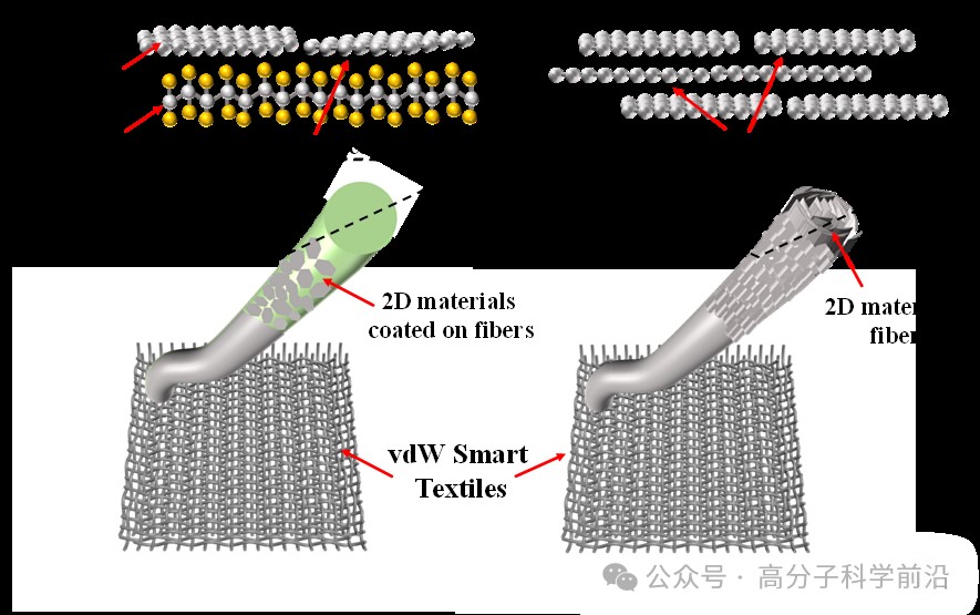 图2 vdW智能纺织品的vdW组装机制。(a)2D材料薄膜在纺织品结构示意图,(b)2D材料纤维结构示意图。