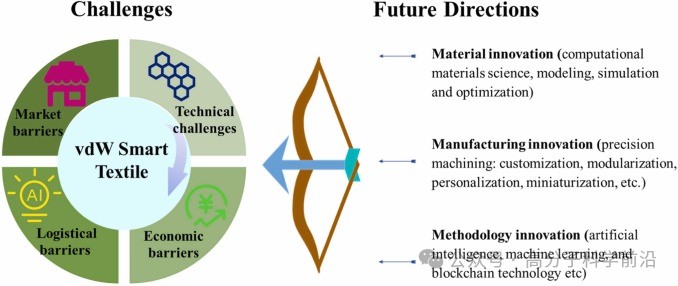 图3 vdW智能纺织品面临的挑战和未来研究方向示意图。