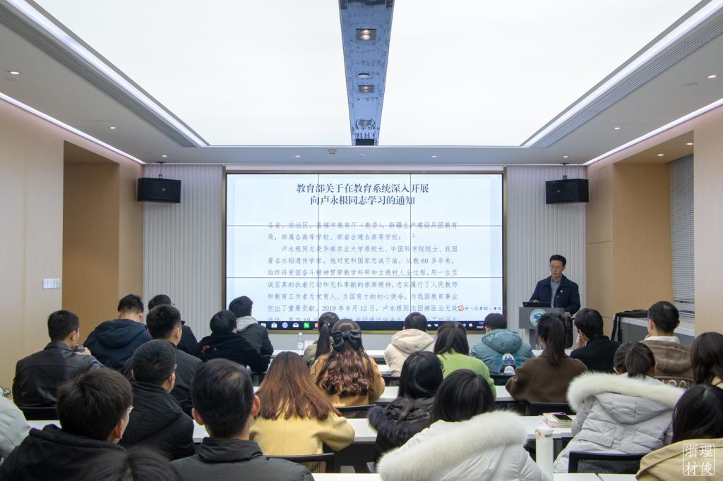 会议伊始,公司党委委员周照东老师带领大家集体学习卢永根同志的先进事迹。他强调,卢永根同志是习近平新时代中国特色社会主义思想的坚定信仰者和忠实践行者,是践行“四有”好老师要求的师表楷模,是新时代崇高师德的杰出典范。全体师生党员要学习卢永根同志爱党爱教,为国家事业矢志奋斗的坚定信念;要学习卢永根同志潜心钻研、为造福人民勇于攀登的赤诚情怀;要学习卢永根同志立德树人、为培育英才鞠躬尽瘁的使命担当;要学习卢永根同志艰苦朴素、为助教励学无私奉献的崇高精神。公司全体党员同志要以卢永根同志为榜样,立足本职做好本职教学、科研、学业等各项工作。