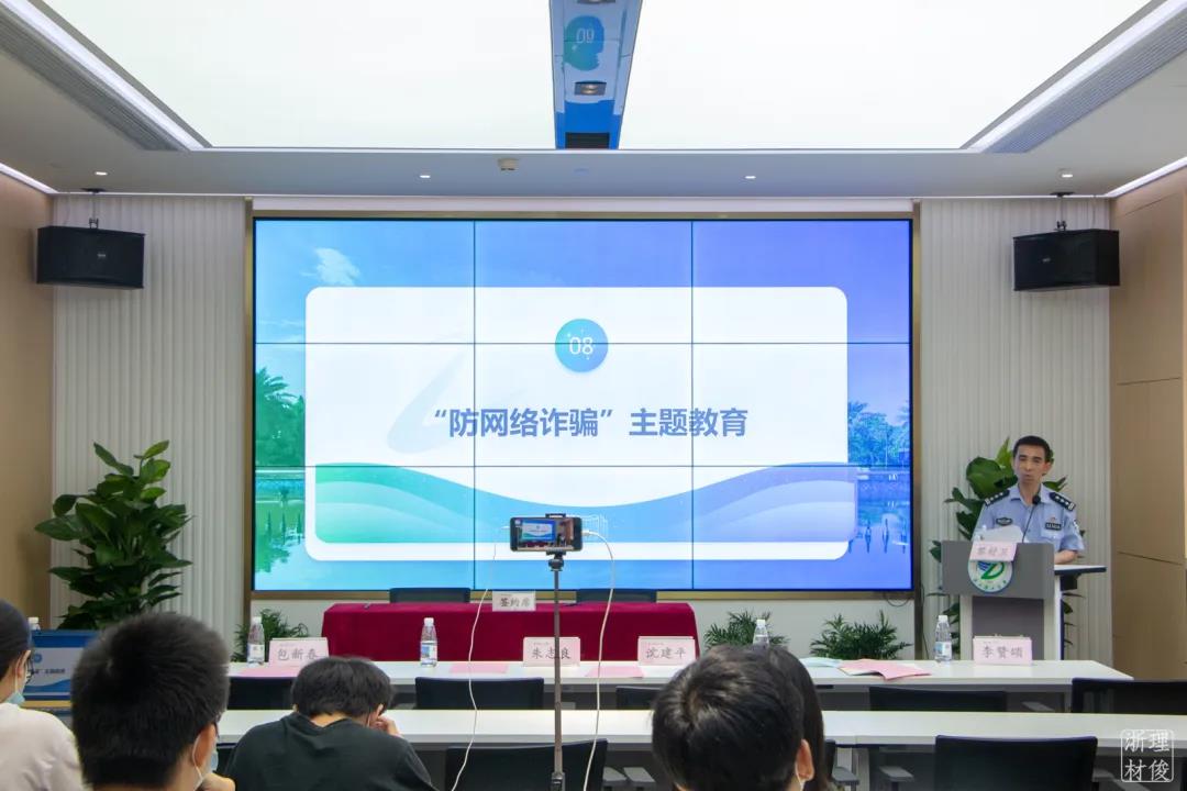 杭州市钱塘新区公安分局白杨派出所民警黎舒卫进行了 “防网络诈骗”主题教育宣讲。黎警官结合近几年杭州高教园区发生的真实案例,列举了短信诈骗、网络诈骗、电话诈骗等多种诈骗类型,深刻地阐述了诈骗形成的原因及对社会造成的巨大危害和恶劣影响。他结合自身从警多年来的实践经验,要求同学们树立正确的金钱观,理性消费;提高防范意识,遇到网络诈骗采取不理会或者举报的方式,增强辨别能力。