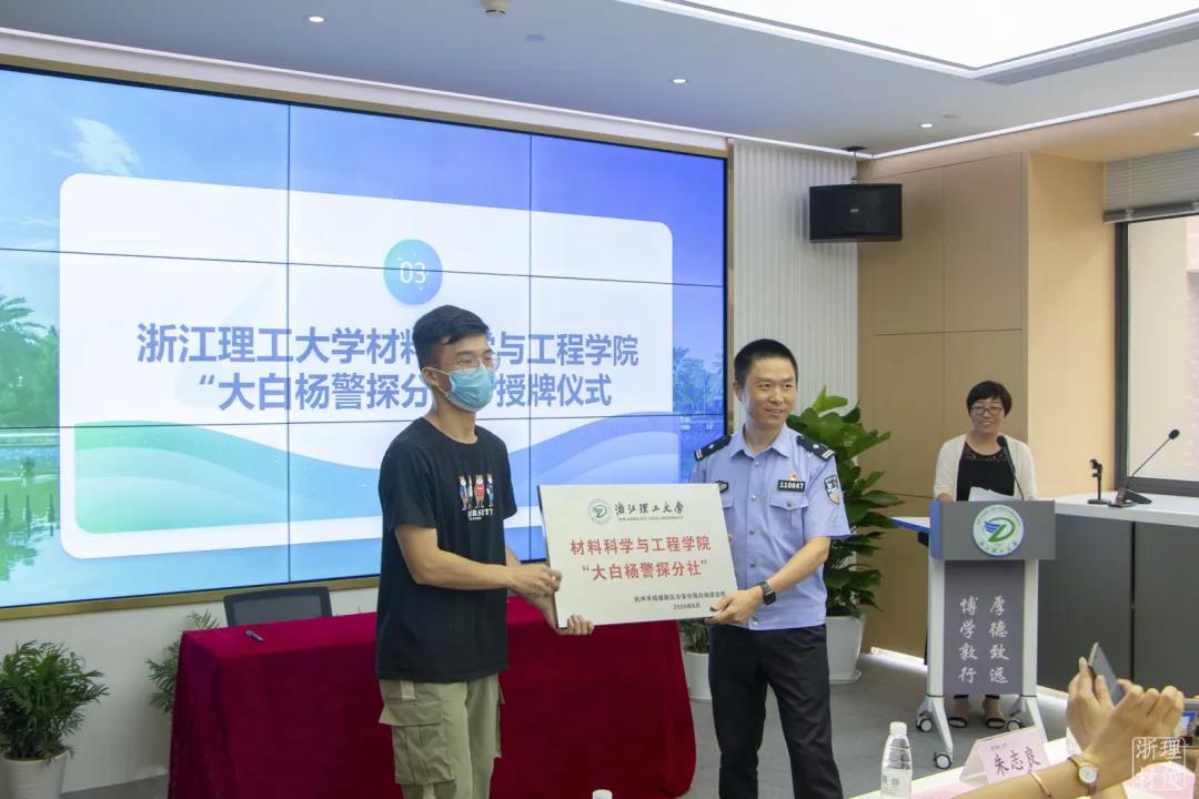 之后,白杨派出所教导员沈建平授予MK体育“大白杨警探分社”称号,公司防诈骗宣传小分队队长林轩同学接牌。