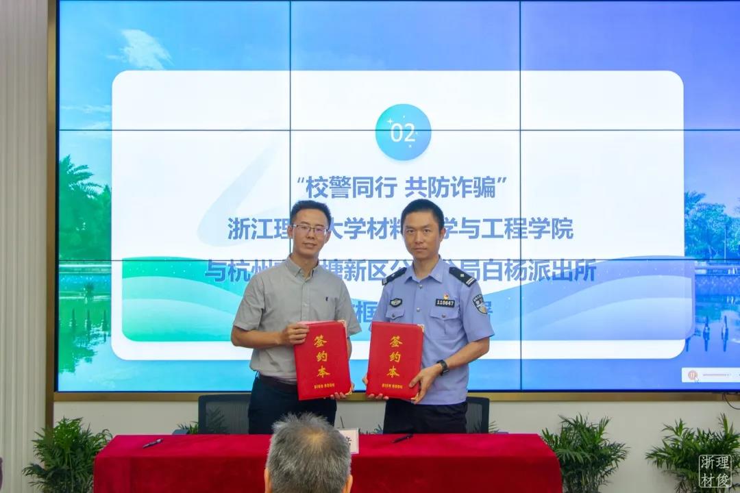 随后,公司党委委员周照东代表公司与杭州市钱塘新区公安分局白杨派出所教导员沈建平签署合作框架协议,进一步明确了校警双方在防诈骗方面的合作内容。