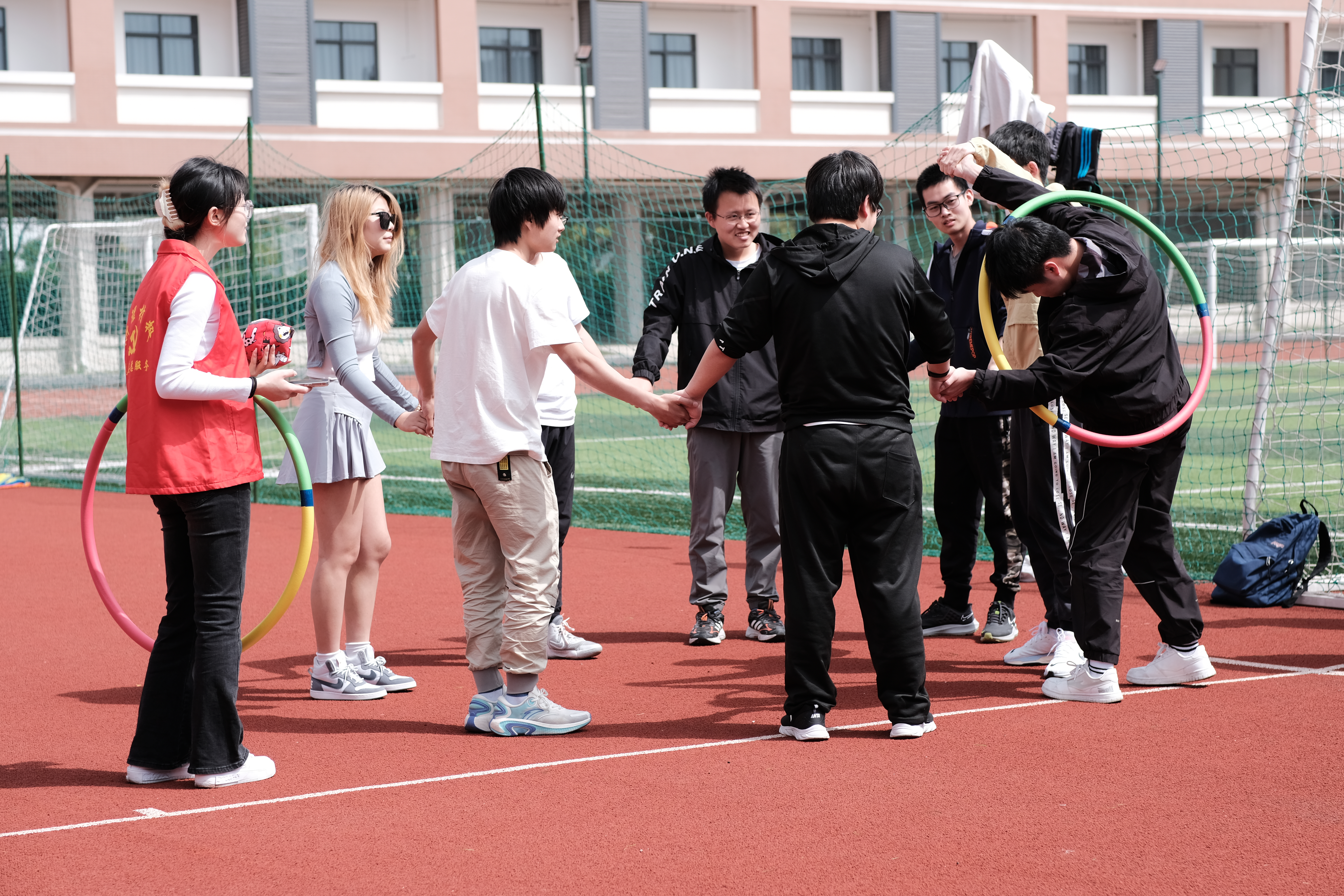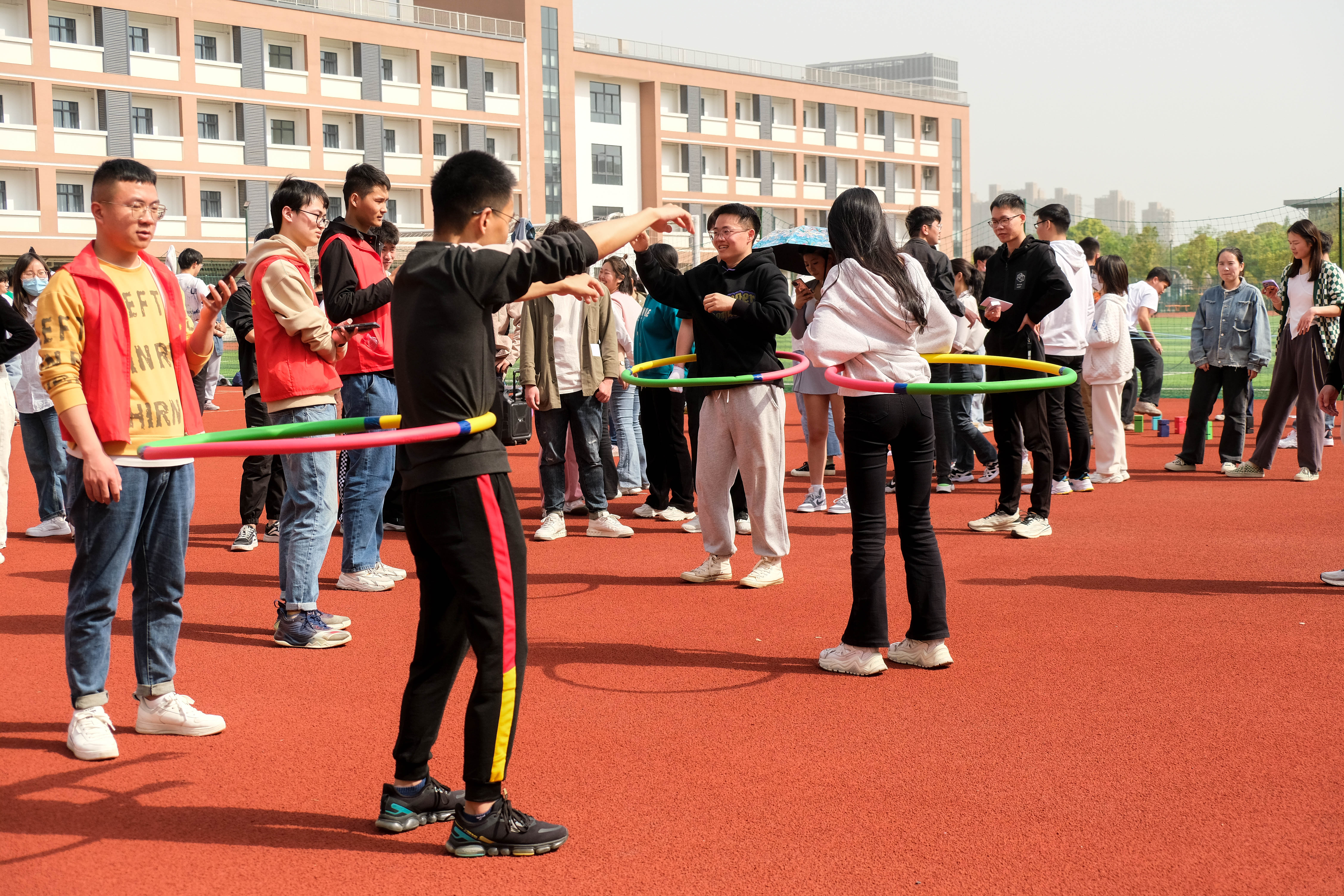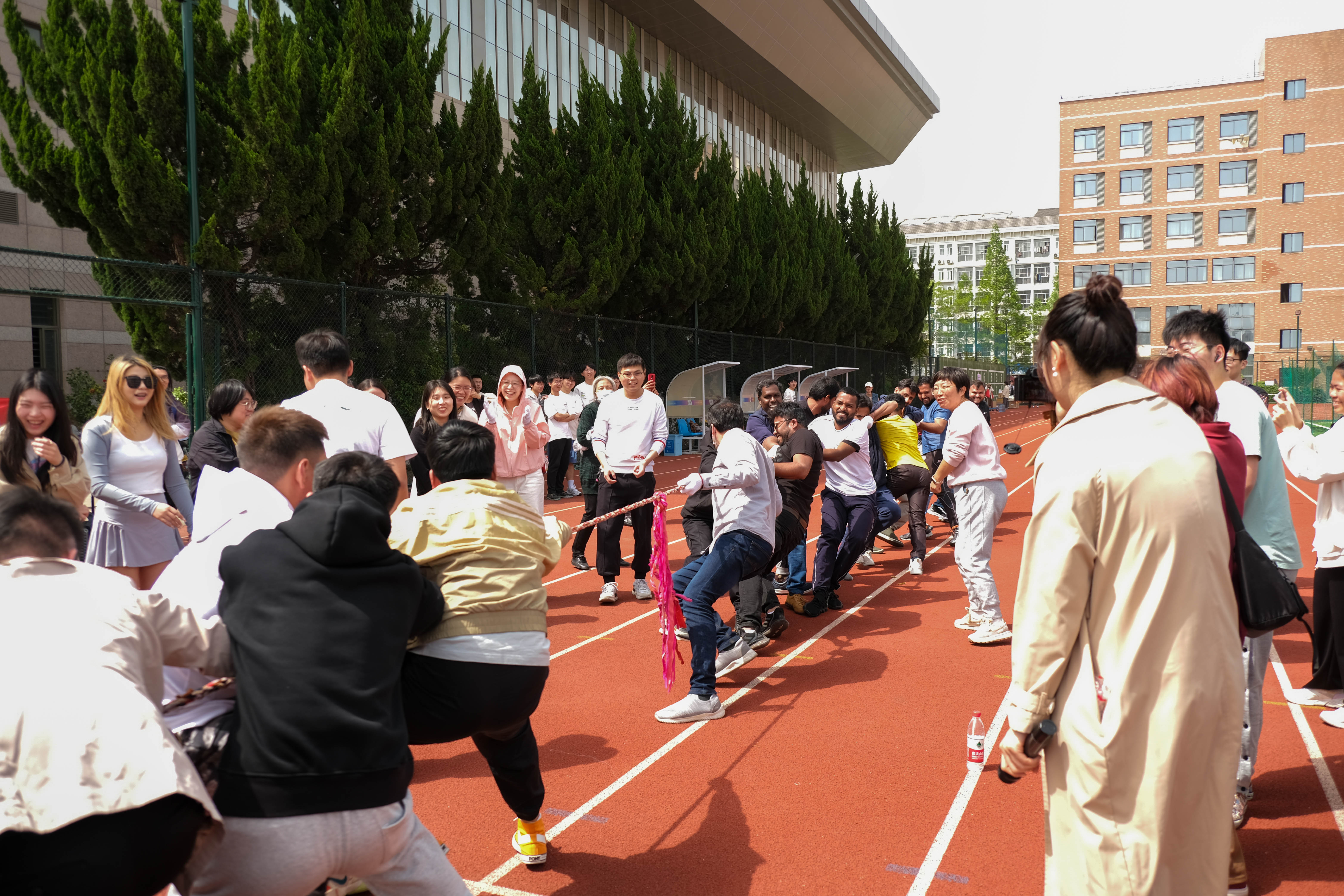 本次趣味运动会设有拔河比赛、无敌风火轮、一圈到底等9个团队项目及夹豆子、跳绳、呼啦圈等5个个人项目。拔河比赛拉开了趣味运动会的帷幕,外籍师生积极参与到比赛中,一根绳,两个队,团结拼,奋力赢。各支队伍的同学在比赛中充分发扬了团结合作精神,在各个项目中拼尽全力,勇争第一,使运动会既充满了趣味性,又充满了挑战性,同学们的欢声笑语和温暖的春风一起飘荡在北田径场。激烈又有趣的比赛项既锻炼了教师和员工的身体,又使各班级和员工组织之间的关系更加亲近,师生间的交流也增进不少。
