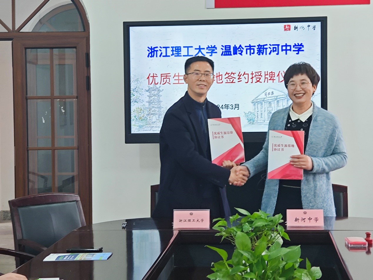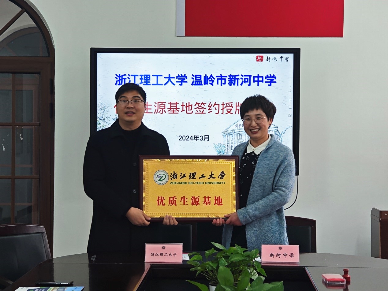 3月14日上午,MK体育赴温岭市新河中学开展“优质生源基地”签约揭牌仪式暨“三位一体”招生宣讲。新河中学副董事长林霞、高三年级部主任陈霞、高三年级部副主王静刚、升学考试中心主任陶正,校招生与就业指导处副处长黄君,公司党委副书记周照东、材料工程系教工党支部书记林文鑫副教授、招生宣传员王依琳参加招生宣讲。