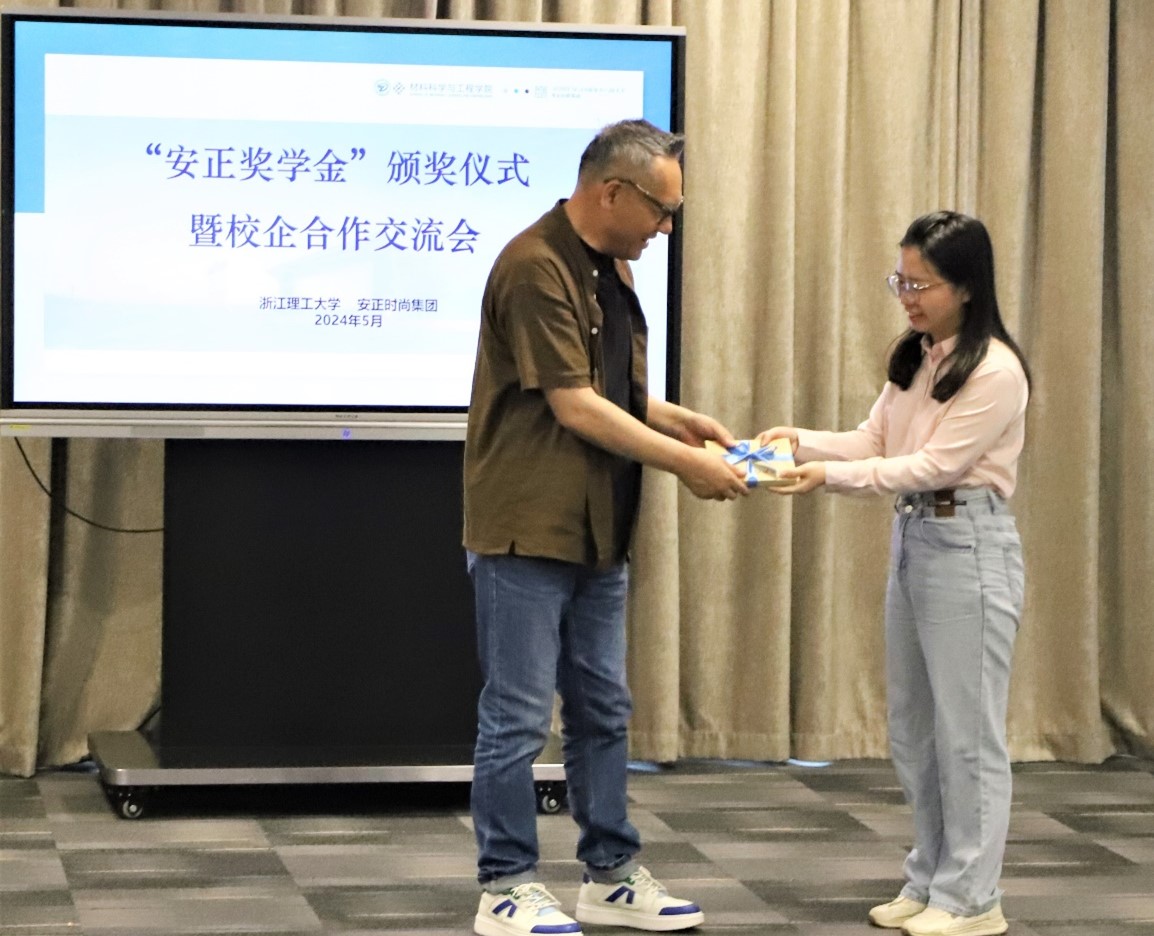 校对外联络办公室主任陈艳宣读2022-2023学年“安正奖学金”获奖名单。安正时尚集团公司党委书记、董事长郑安政为获奖员工颁发证书。