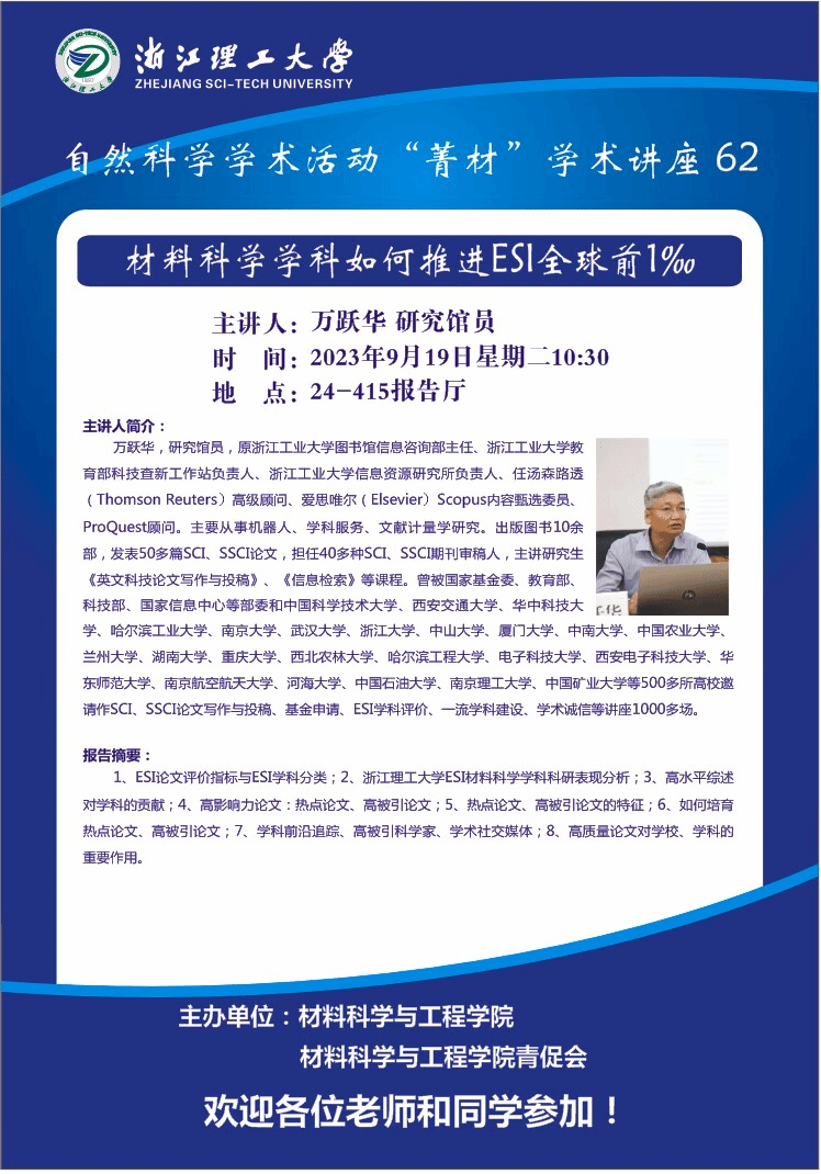 学术讲座【62】:材料科学学科如何推进ESI全球前1‰