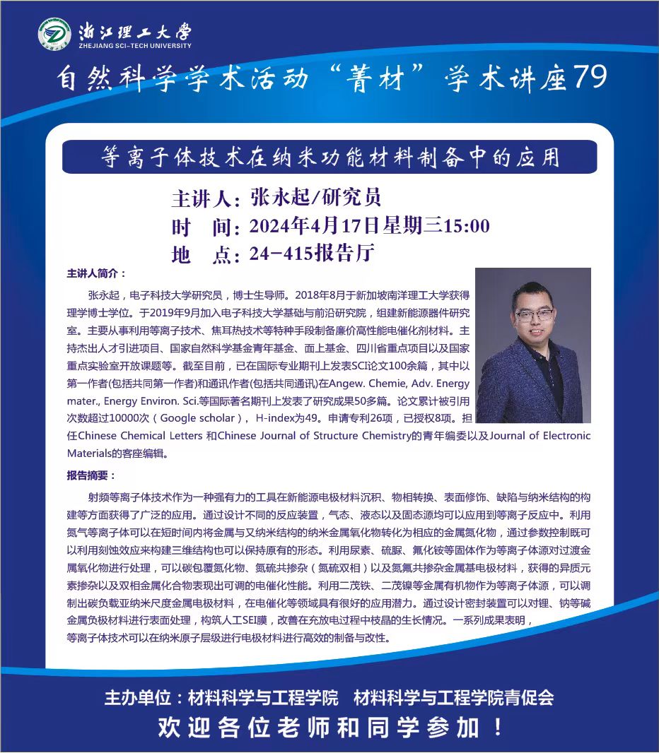 学术讲座【79】:等离子体技术在纳米功能材料制备中的应用