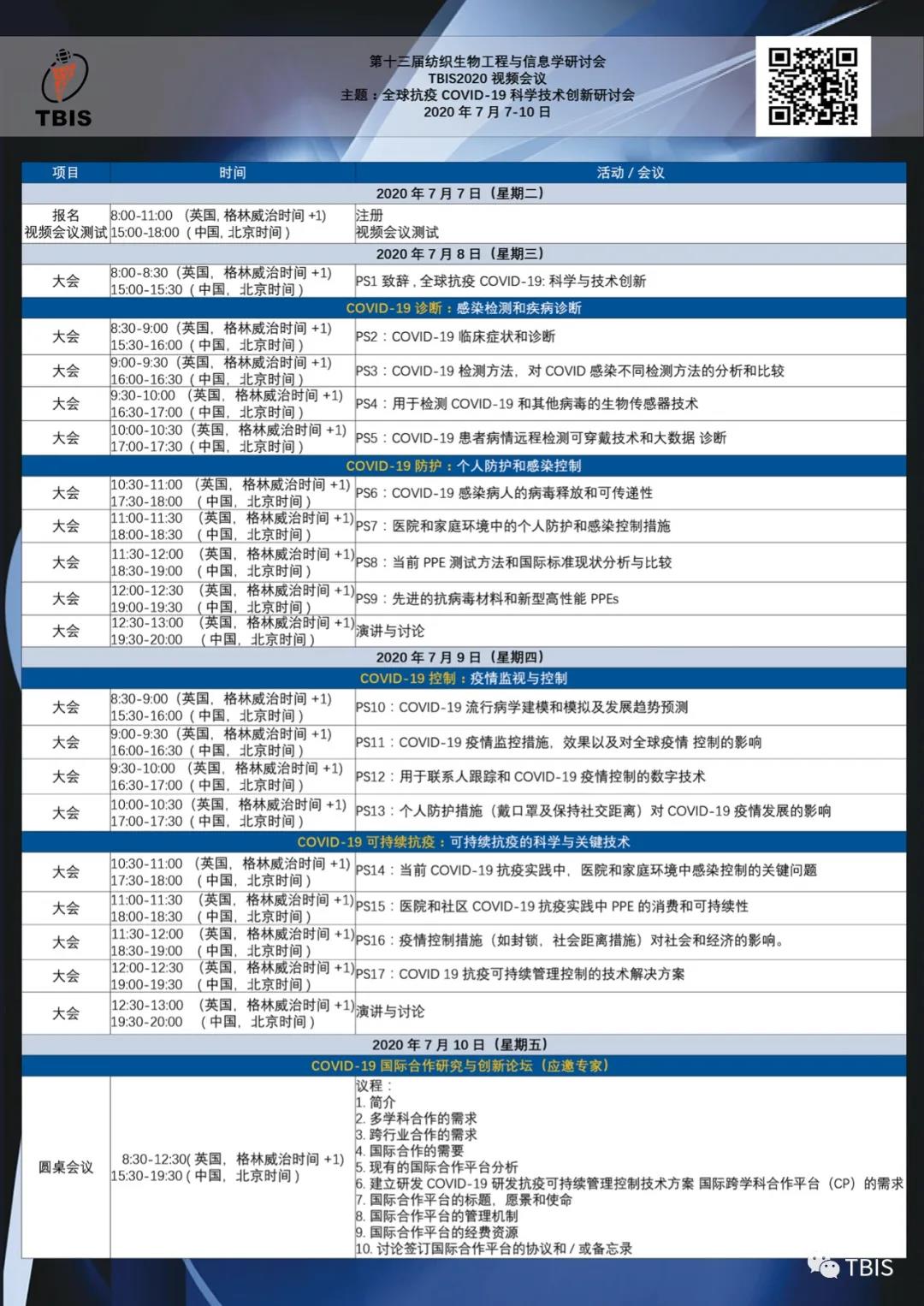 2020年7月8日至9日,会议前两日的议程,大会邀请了跨学科的国际知名学者,专业和行业专家就17个具体主题进行TBIS主题报告。