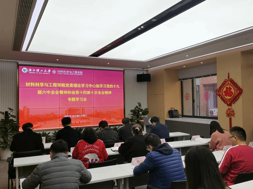 高分子材料系主任张明同志围绕省委十四届十次全会精神进行主题发言。张老师结合浙江省近年来发展现状和自身工作,谈到深入学习贯彻党的十九届六中全会精神,紧扣“五大历史使命”,牢固树立“没有走在前列也是一种风险”的紧迫感和忧患意识,作为高校教师要努力做好本职工作,努力做到“干在实处,走在前列”,在党的下一个百年征程中续写新的传奇。