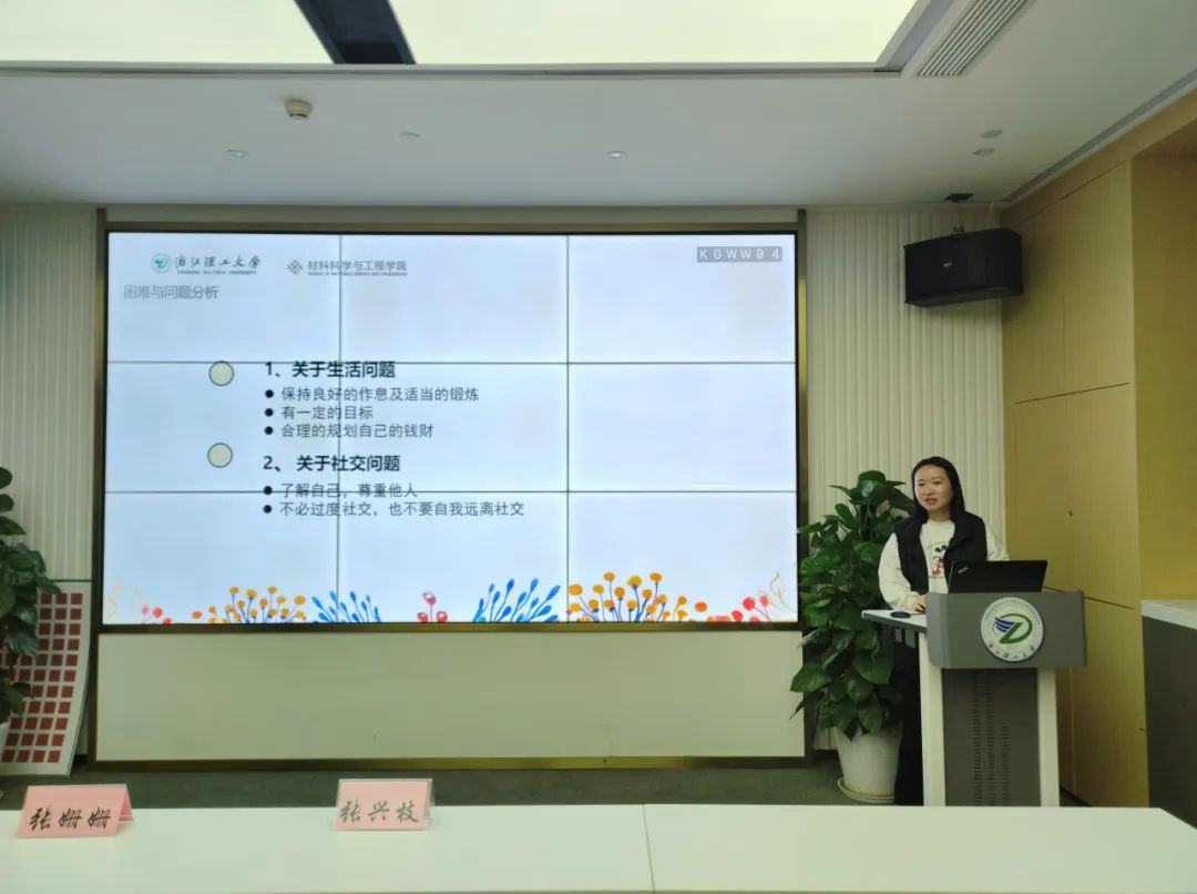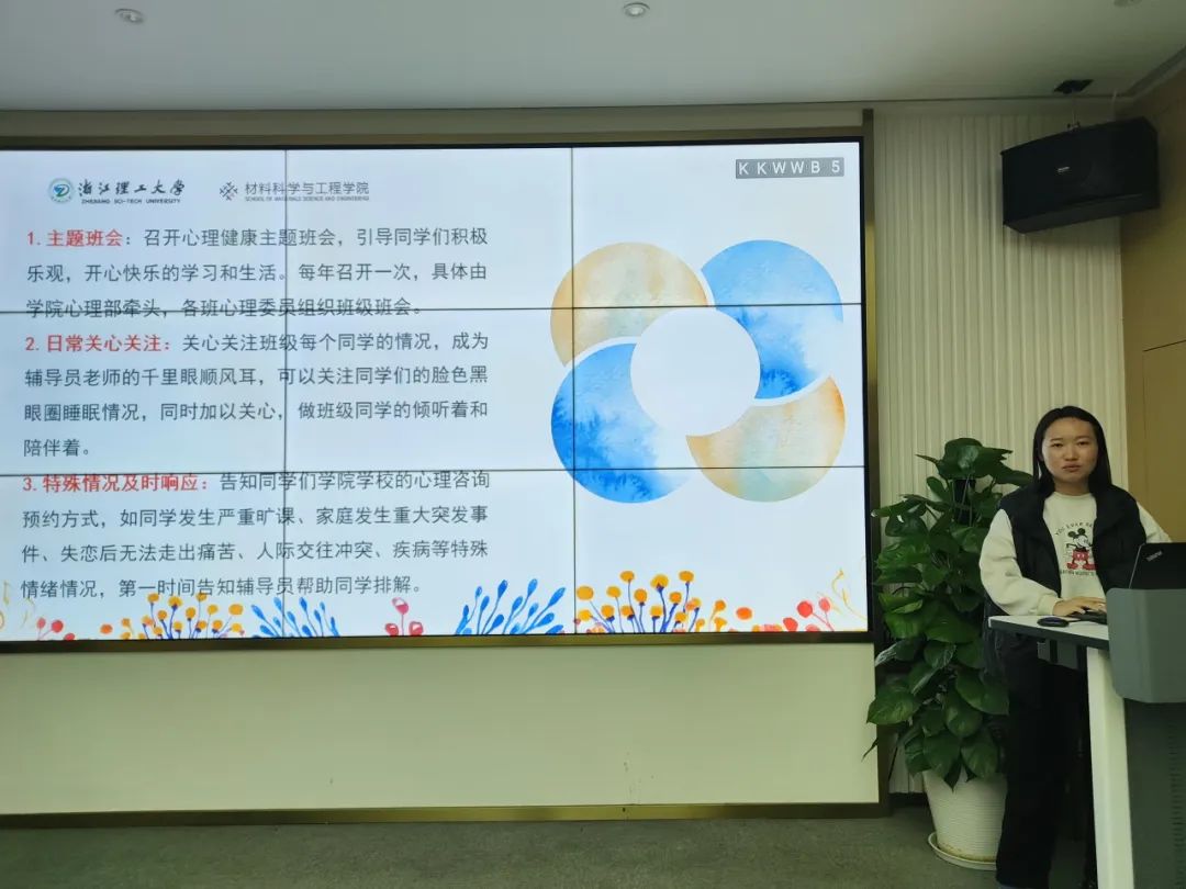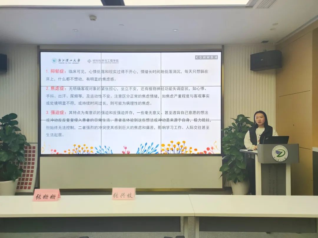 张兴枝老师介绍了心理委员的工作职责与内容,其中包括引导同学们积极乐观地学习和生活、日常关心关注同学的情况、特殊情况及时响应、普及心理咨询预约方式以及完成心理健康周报告等。