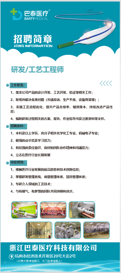 招聘岗位:工艺/研发工程师工作职责:1、落实公司产品的设计开发、工艺开发、验证等相关工作;2、发现并解决各类问题(市场投诉、生产不良、设备异常等);3、实施工艺流程优化,提升产品合格率,增效降本,持续改进产品性能;4、编制研发过程相关的方案、报告、作业指导书及注册资料等文件。招聘条件:1、本科及以上学历,高分子相关化学化工专业、机械电子专业;2、极强的动手能及学习能力;3、有较强的责任意识,良好的团队协作精神和沟通能力;4、立志在医疗行业长期发展。你能得到:1、接触医疗行业发展的前沿趋势和技术创新信息;2、掌握研发管理系统、质量管理体系、项目管理体系;3、专研介入领域的工艺技术;4、与有朝气、有梦想的团队共同拼搏和进步。