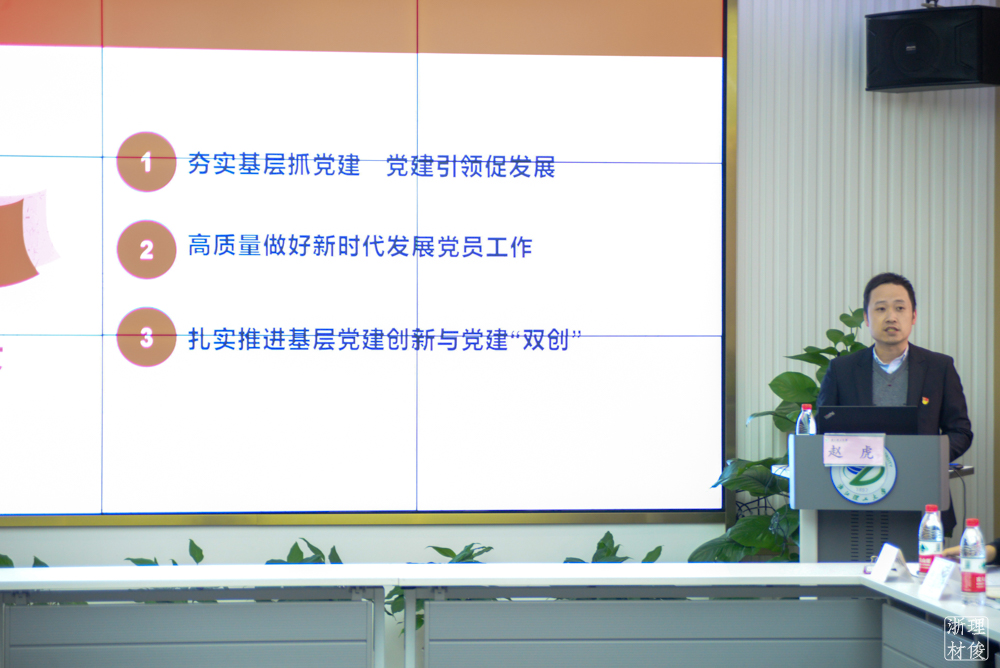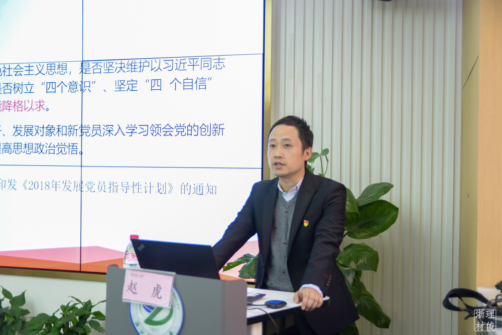 会上,赵虎老师以“学习‘七一’讲话 守好‘红色根脉’扎实推进高校基层党组织全面过硬”为主题,从“夯实基层抓党建,党建引领促发展”、“高质量做好新时代发展党员工作”、“扎实推进基层党建创新与党建‘双创’”三个部分进行培训分享。